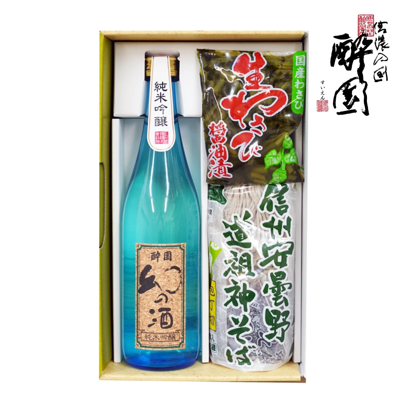 【送料無料】酔園 幻の酒ブルーと蕎麦詰合せは、口当たりが柔らかく飲みやすい純米吟醸と安曇野特産の蕎麦とわさび醤油漬けが詰まった贅沢なセットです。